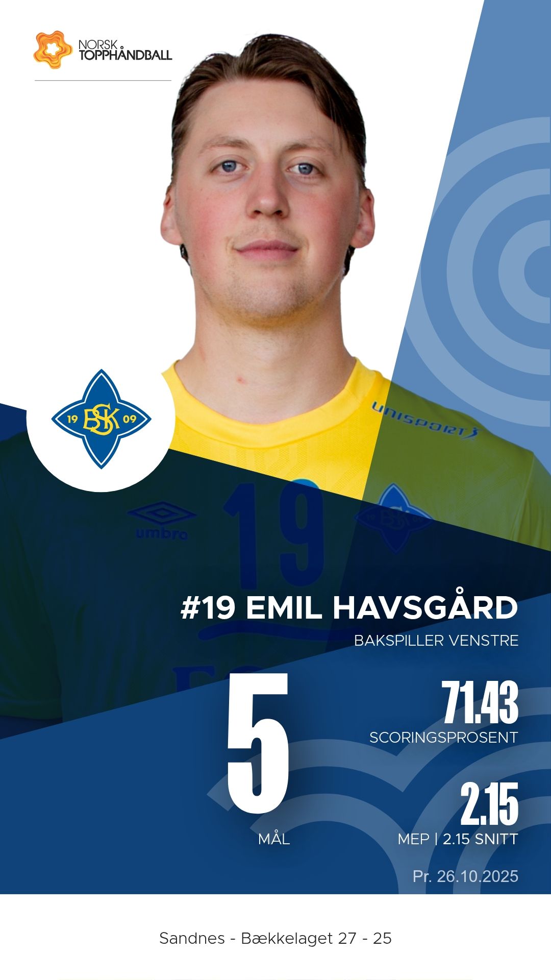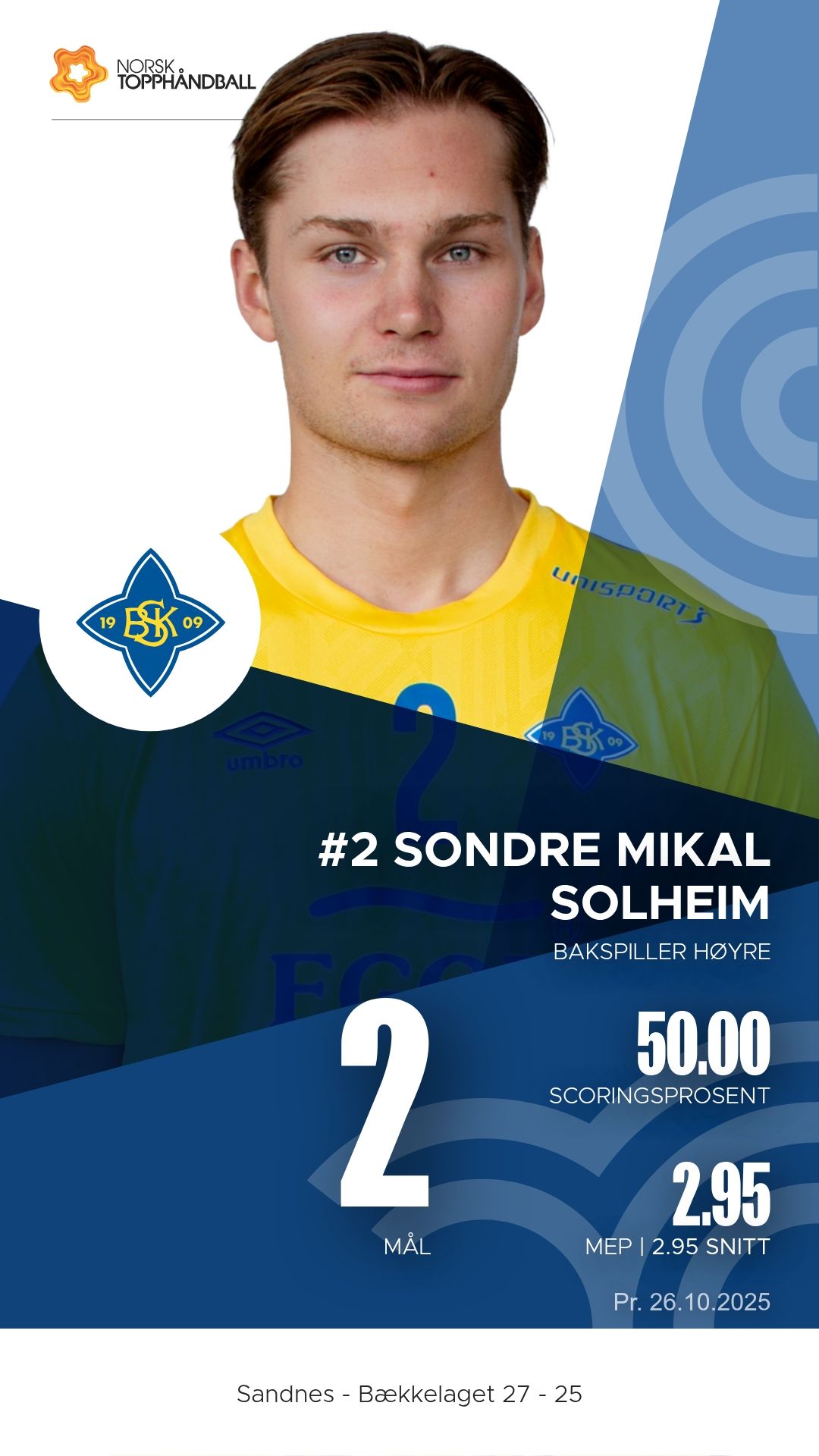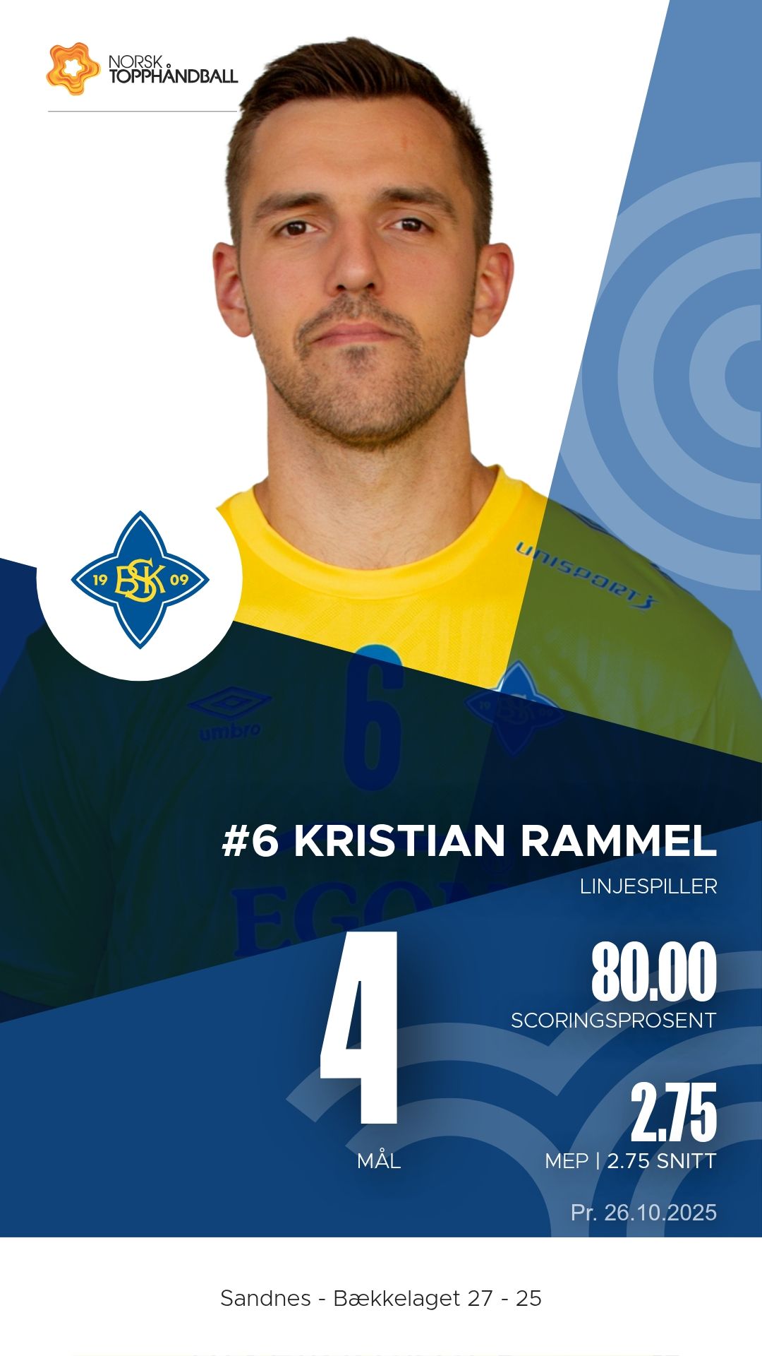 Søndag 26. oktober 2025 møttes Sandnes og Bækkelaget i Sandneshallen til kamp i REMA 1000-ligaen for menn, sesongen 2025–2026. Hjemmelaget vant 27–25 etter en jevn og intens kamp der bortelaget lenge var fullt på høyde med vertene.